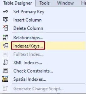 Step 2: On the Table Designer menu, click on Indexes/Keys.
