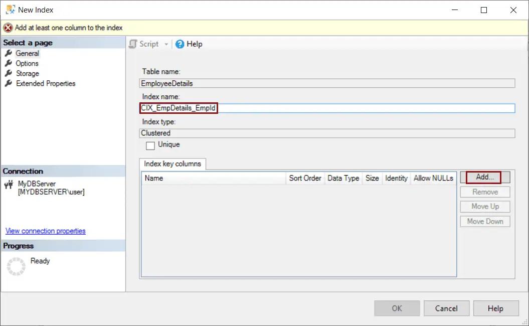 Step 3: In the New Index dialog box, on the General page, enter a name of an index under the Index Name and click on the Add button under the Index Key Columns, as shown below.