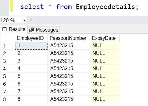Now, Select * from EmployeeDetails; will return the following result.