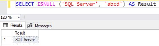 SELECT ISNULL('SQL Server', 'abcd') AS Result;