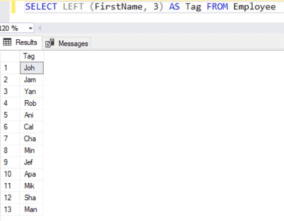SELECT LEFT(FirstName, 3) AS Tag FROM Employee;
