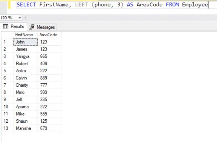 SELECT FirstName, LEFT(phone, 3) AS AreaCode FROM Employee;