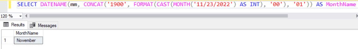 SELECT DATENAME (mm, CONCAT('1900', FORMAT(CAST(MONTH('11/23/2022') AS INT), '00'), '01')) AS MonthName