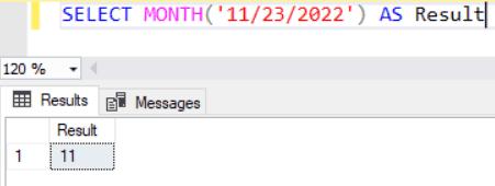 In the following example, the MONTH() function returns a month as an integer from the specified date string literal in 'MM/dd/yyyy' format.