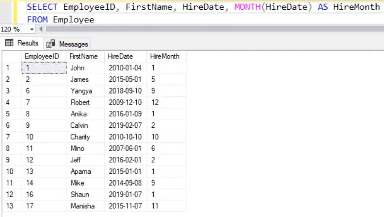 SELECT EmployeeID, FirstName, HireDate, MONTH(HireDate) AS HireMonth FROM Employee