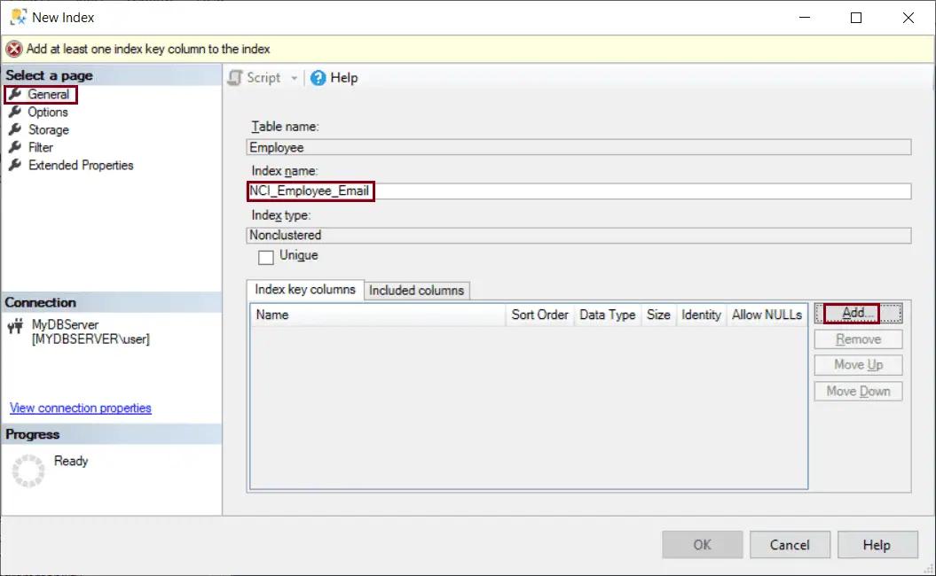 Step 4: Click on the Add button under the Index Key Columns, as shown below.