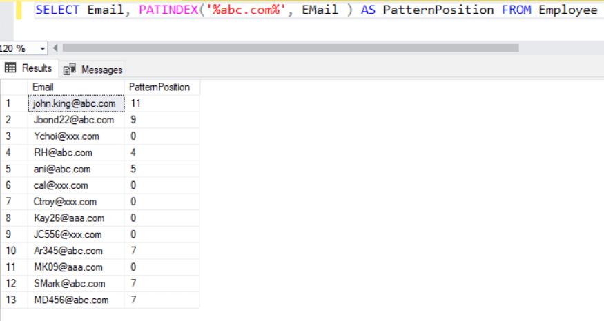 SELECT Email, PATINDEX('%abc.com%', EMail) AS PatternPosition FROM Employee