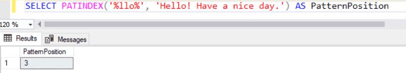 SELECT PATINDEX ('%llo%', 'Hello! Have a nice day.') AS PatternPosition