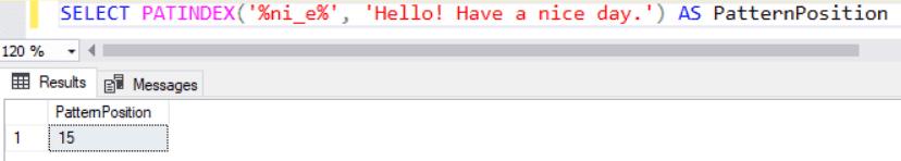 SELECT PATINDEX('%ni_e%', 'Hello! Have a nice day.') AS PatternPosition