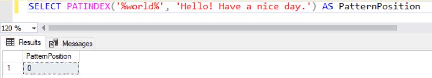 SELECT PATINDEX('%world%', 'Hello! Have a nice day.') AS PatternPosition