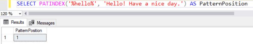 SELECT PATINDEX('%hello%', 'Hello! Have a nice day.') AS PatternPosition