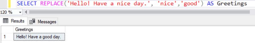 SELECT REPLACE('Hello! Have a nice day.', 'nice', 'good') AS Greetings;