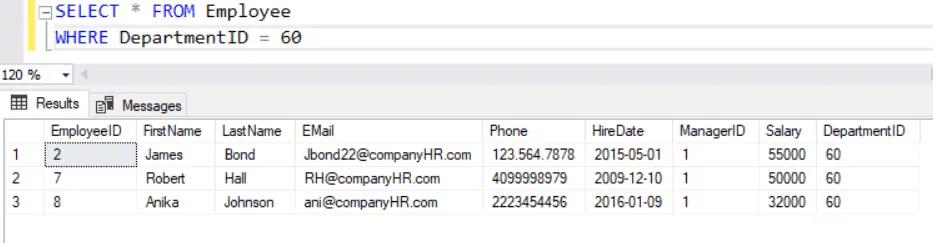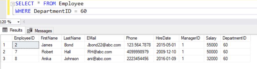 Consider the following Employee data where DepartmentID=60.