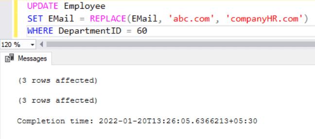 In the following example, the Email column of the Employee table is the input. The REPLACE() function replaces any occurrence of 'abc.com' with '***.com'.