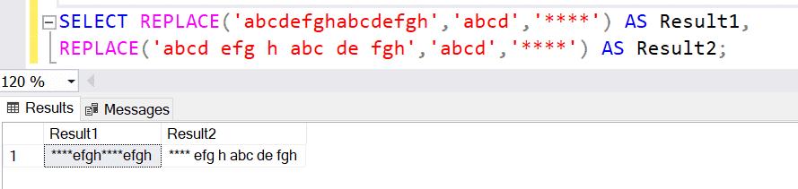 SELECT REPLACE('abcdefghabcdefgh','abcd','****') AS Result1,