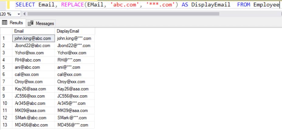 SELECT Email, REPLACE(EMail, 'abc.com', '***.com') AS DisplayEmail FROM Employee;