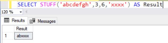 SELECT STUFF('abcdefgh',3,6,'xxxx') AS Result;