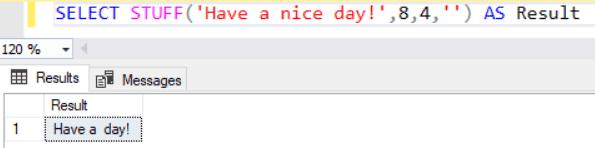 SELECT STUFF('Have a nice day!',8,4,'') AS Result;