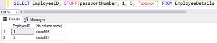 In the following example, the STUFF() function is used in masking sensitive data like the passport number. The first 5 characters of the passport number are replaced with 'xxxxx' as shown in the query below.
