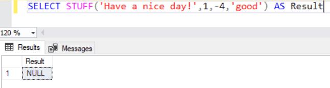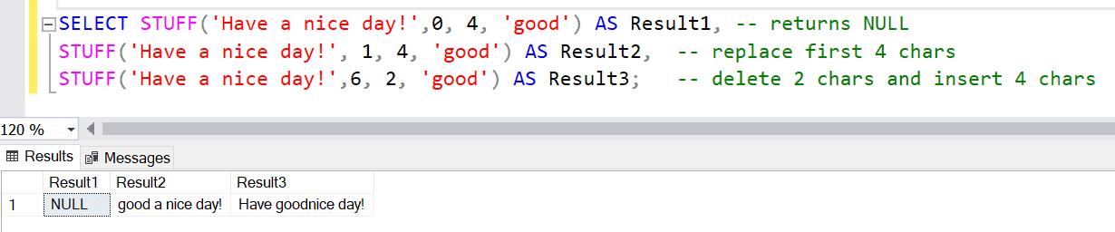 SELECT STUFF('Have a nice day!',0, 4, 'good') AS Result1,