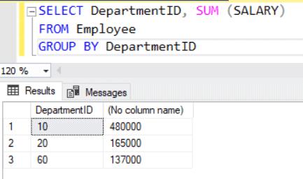 Use the DepartmentID with the GROUP BY clause to use the SUM() function with the it, as shown below.
