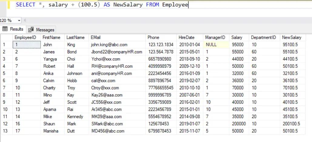 SELECT *, salary + (100.5) AS NewSalary FROM Employee;