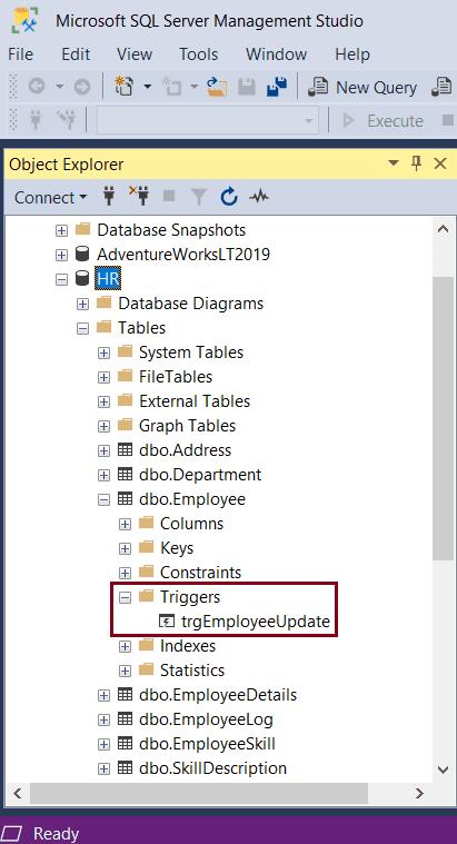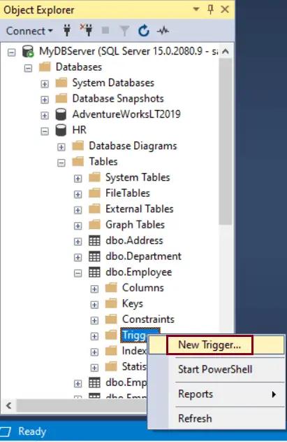 Step 7: Refresh the table. The new trigger will be created under the Triggers folder of the table.
