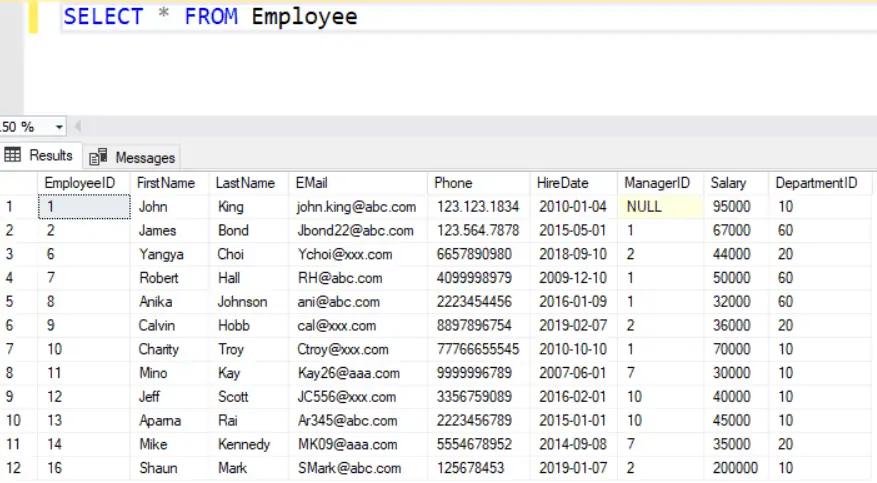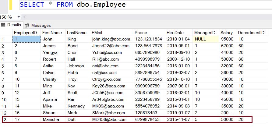 ,20)The above will insert a new row in the Employee table, as shown below.