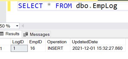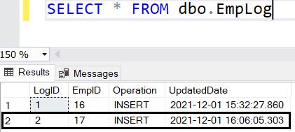 The trgEmployeeInsert will be fired and insert a row in the EmpLog table, as shown below.
