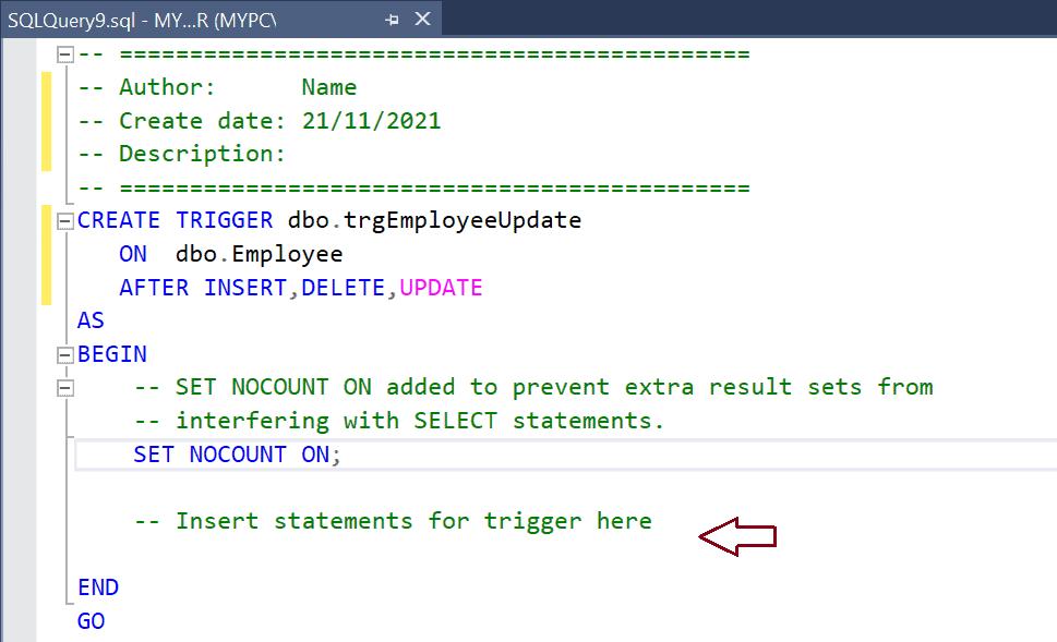 Step 4: In the Query Editor, enter the SQL statements for the trigger in the commented section – insert statements for trigger here.