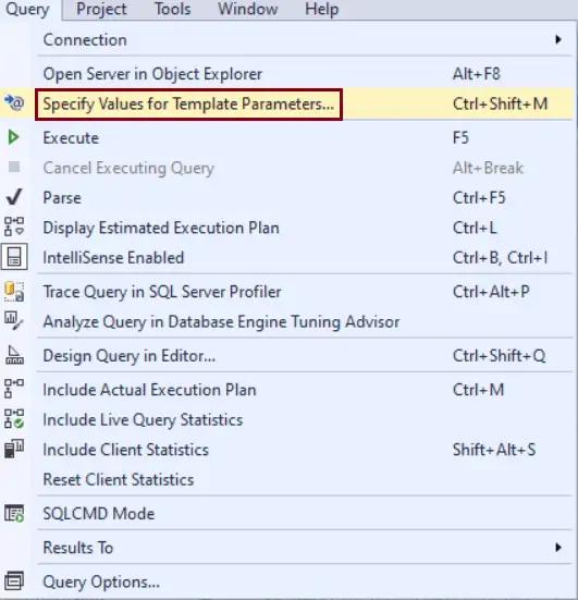 Step 3: In the Query menu, click Specify Values for Template Parameters.