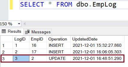 WHERE EmployeeID = 2;Now, select rows from the EmpLog table. The trgEmployeeUpdate trigger should have inserted a new row in the EmpLog table, as shown below.
