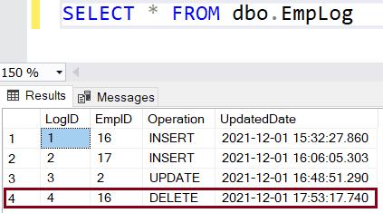 WHERE EmployeeID = 16;The above statement will fire the trgInsteadOfDelete trigger which will insert a new row in the EmpLog table instead of deleting a row in the Employee table.