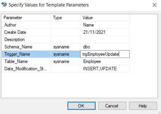 In the dialog box, specify the trigger name, date created, schema name, author of the trigger, and fill the other parameters. Click Ok.