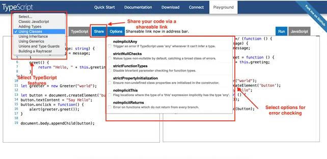 This is a great place for beginners to learn TypeScript and try different TypeScript features. You also have the option to share your code via a shareable link provided by the playground.